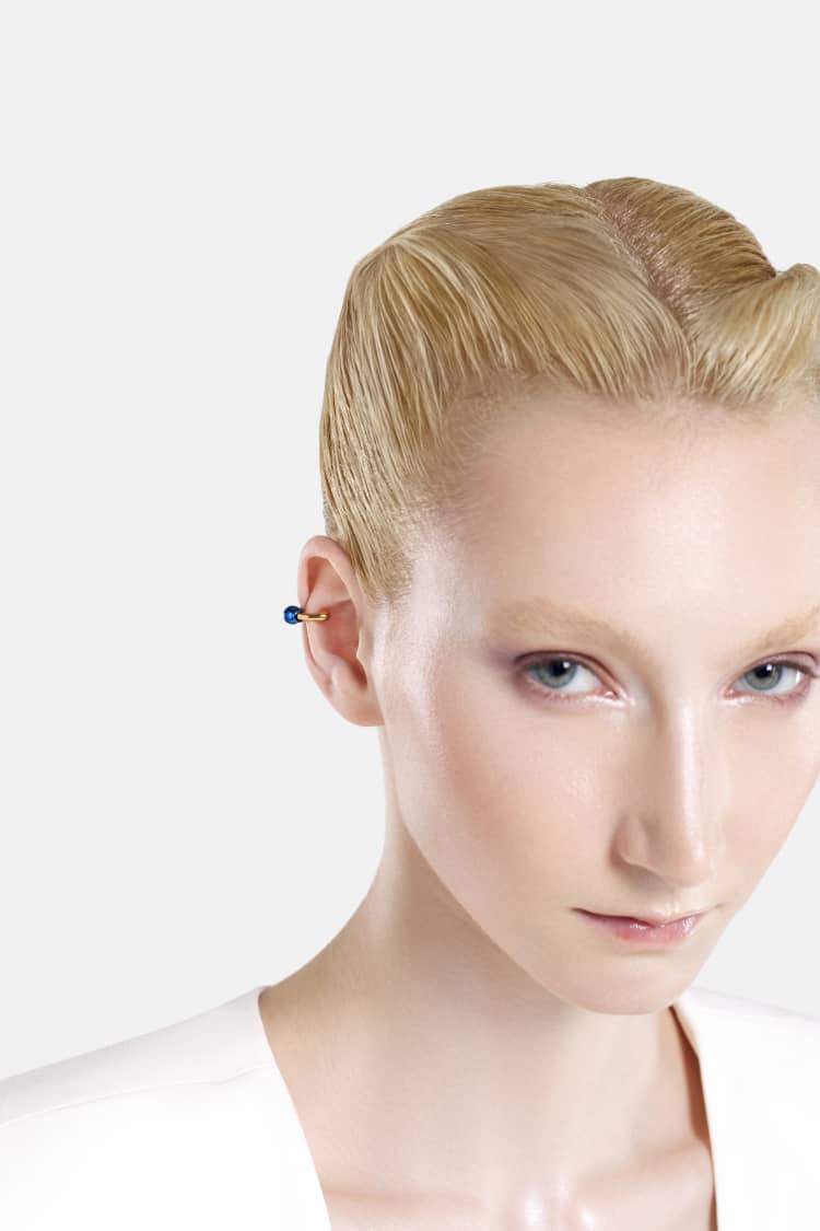 Discover the Casa Batlló huggie earcuff in gleaming gold and vibrant blue, a sculptural jewelry piece that adds Gaudí-inspired elegance and color to any look.